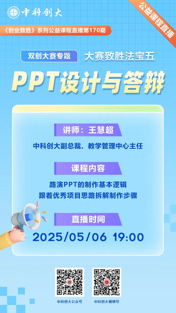 创业致胜2025年春季学期第9次课(总第170期)将于5月6日晚7点准时开播。本次课程主题为《PPT设计与答辩》,将带领同学们跟着优秀项目拆解路演PPT的制作步骤。课程领读人为中科创大王慧超老师。扫描海报二维码即可观看。创业致胜,不见不散。