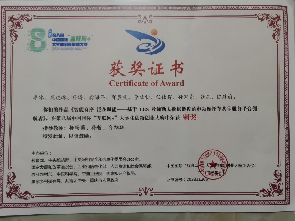 公司作品《智能有序 泛在赋能一基于 LBS 及通勤大数据调度的电动摩托车共享服务平台领航者》,在第八届中国国际“互联网+”老员工创新创业大赛中荣获铜奖
